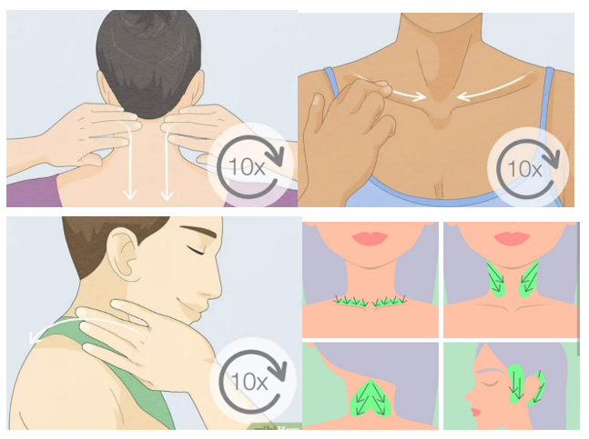 - Vrat → ključna kost – pokreti odozgo nadole, kao da spuštate limfu ka grudima.
